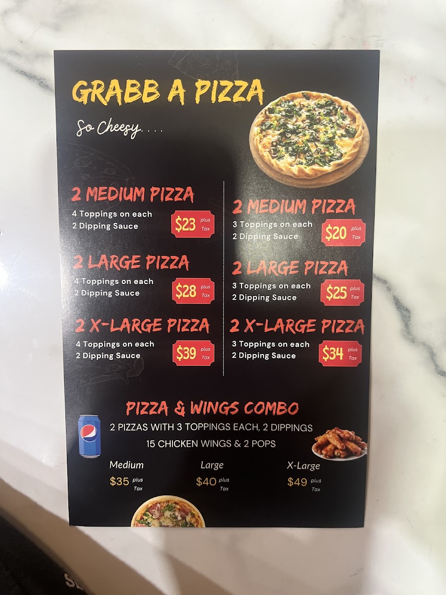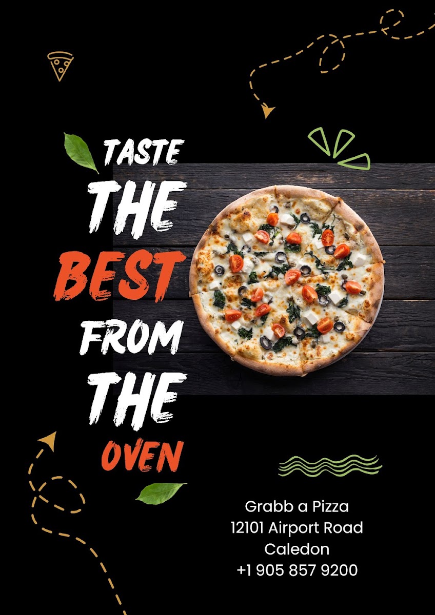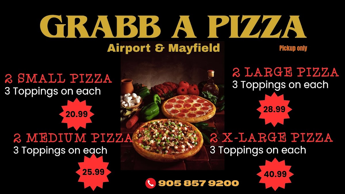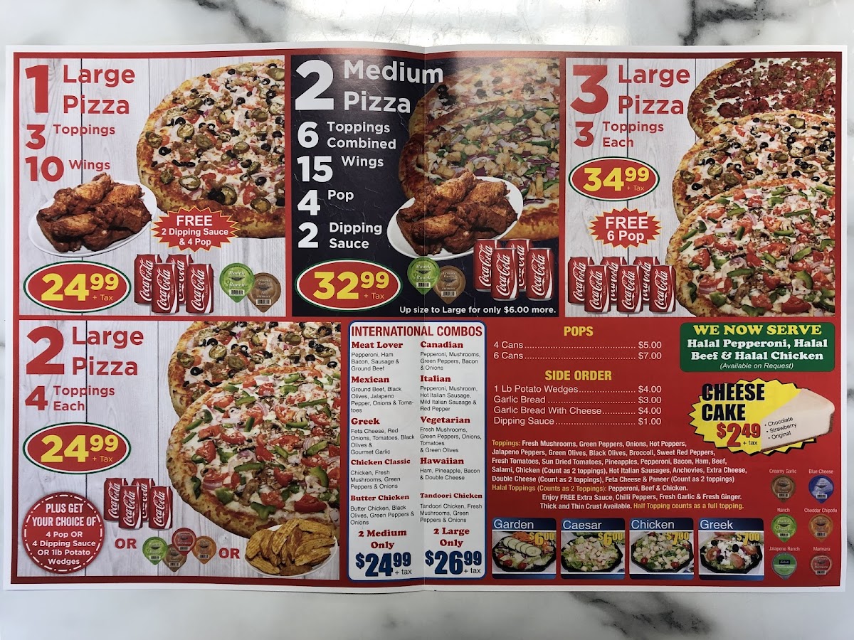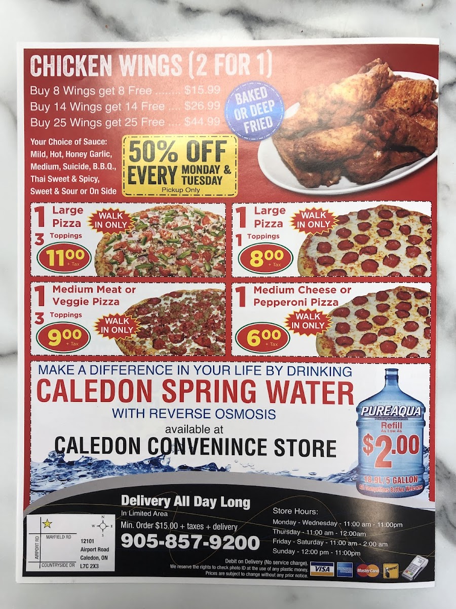 This menu offers a variety of pizza options along with beverages, designed primarily for takeaway, delivery, or casual dining at the restaurant located in Caledon, ON. The menu is organized into distinct categories that provide a range of choices suitable for lunch, dinner, or any casual meal occasion.