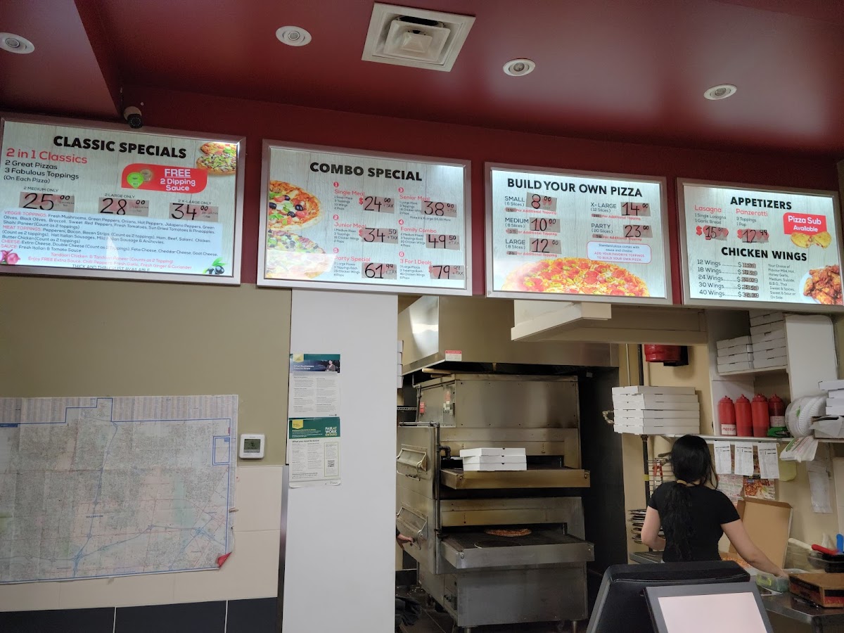 Pizza Selection: The core of the menu features a wide assortment of single pizzas priced uniformly, including vegetable toppings such as green peppers, red peppers, black olives, broccoli, jalapeño peppers, and sliced tomatoes. Meat options include ham, beef, sausage, pepperoni, bacon, and hot pepper varieties. Cheese-based pizzas such as feta cheese and extra cheese are also available.