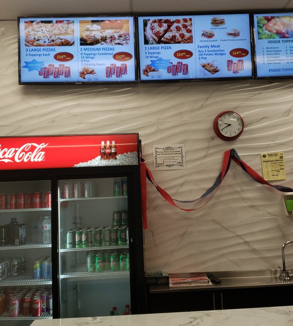This menu structure supports quick ordering for takeaway or delivery as well as casual dining, accommodating varying preferences from vegetarian to meat-based pizzas alongside beverage options.